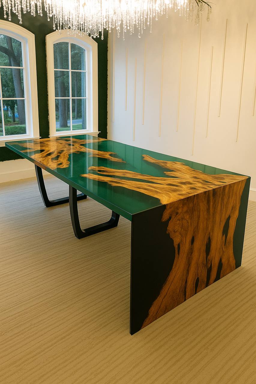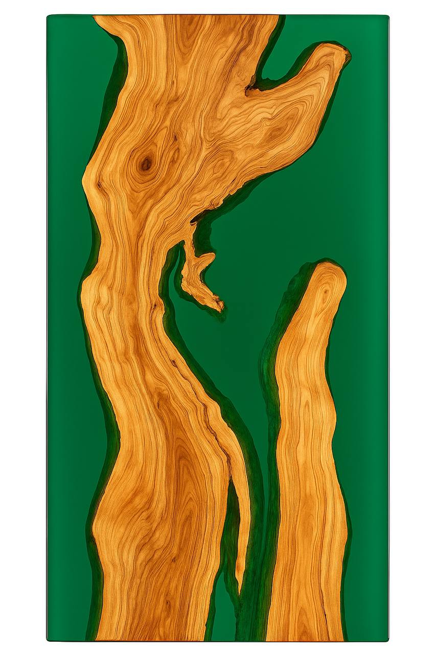 A masterpiece of craftsmanship and design, the Emerald Olive Root Epoxy Dining Table celebrates the harmony between nature and modern artistry. Hand-crafted from genuine olive tree wood, its flowing root patterns are encased in a vibrant emerald-green epoxy resin that shimmers with depth and elegance.