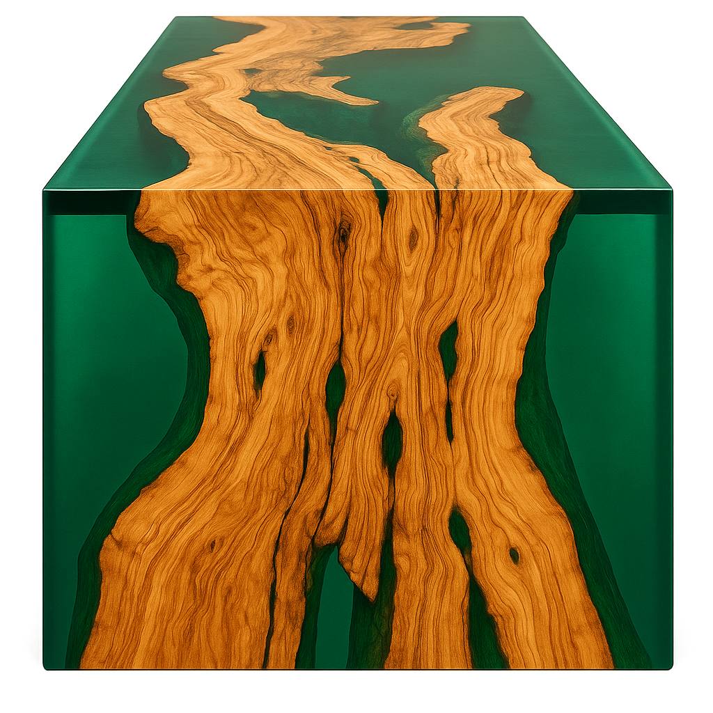 The golden warmth of the olive wood contrasts beautifully with the rich green tones, creating a table that feels alive with movement and energy. Seamless waterfall edges extend the design fluidly down the sides, transforming this piece into both functional furniture and sculptural art.