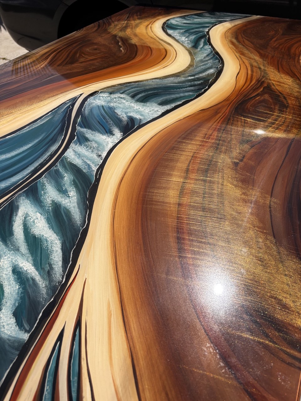 This handcrafted epoxy resin table features a bold and dynamic design that resembles a flowing river through winding canyons. Each element — from the vivid blue waters to the crashing white currents — is individually hand-painted by a professional artist before being sealed in epoxy. The layered wood tones and rich textures come together in a visually stunning composition that feels alive with movement and energy.
