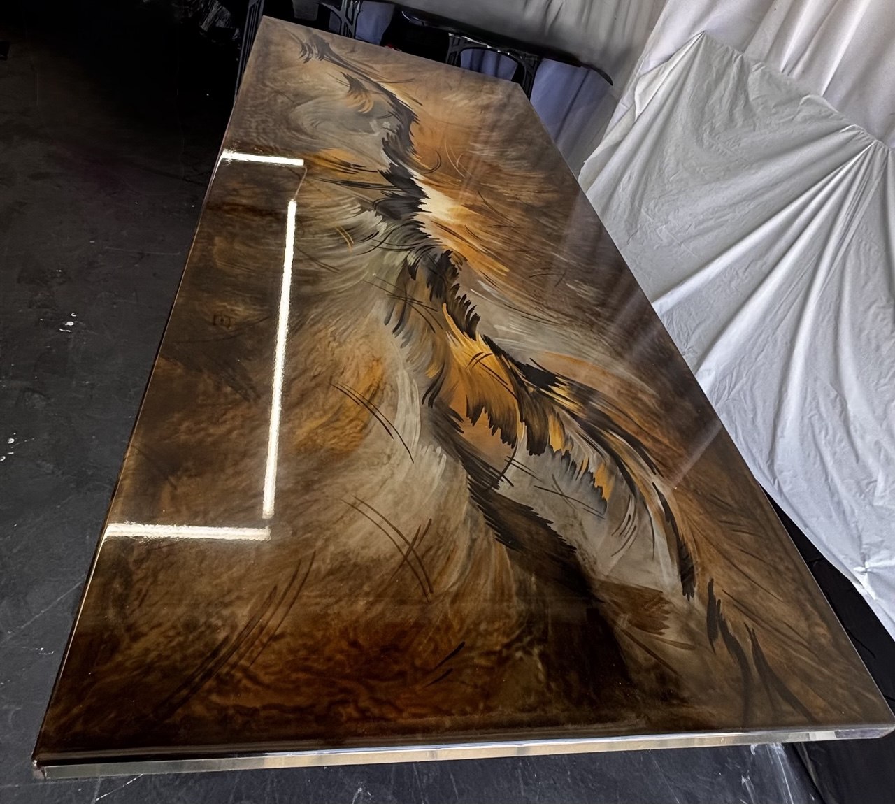 • Full epoxy resin tabletop with layered, hand-painted flame-inspired design