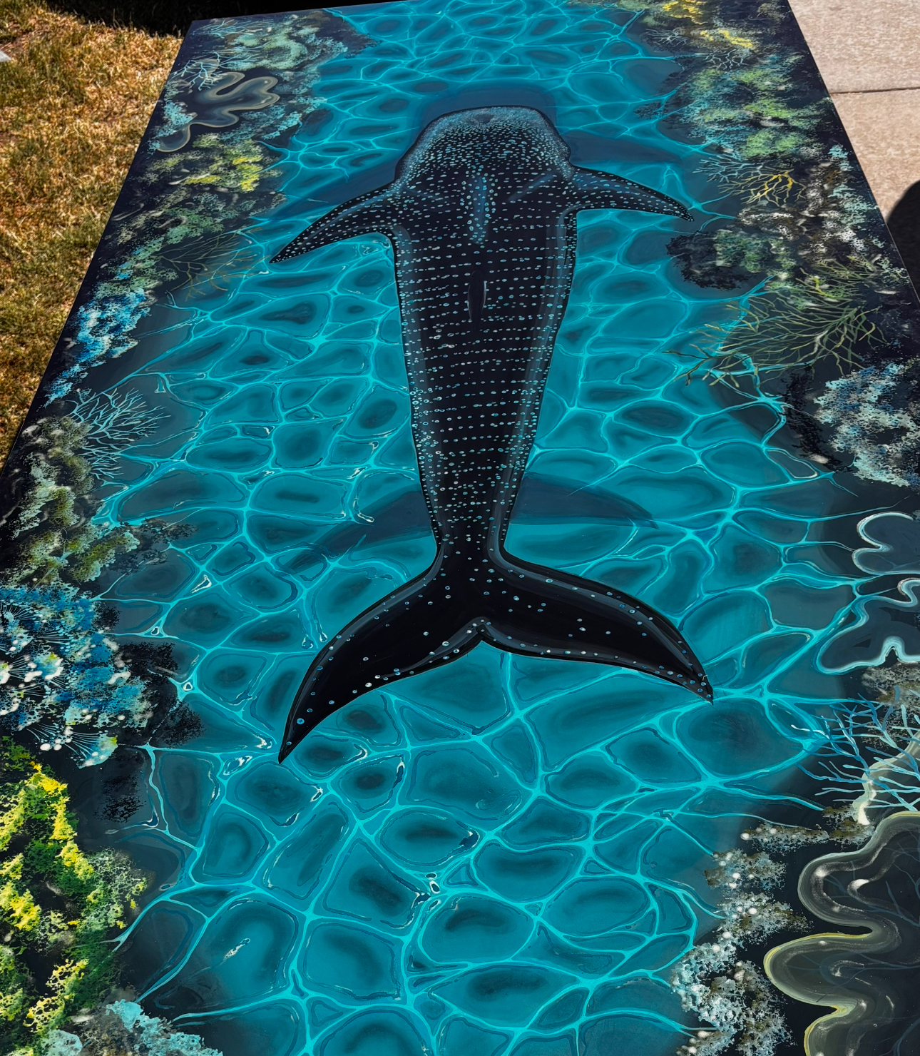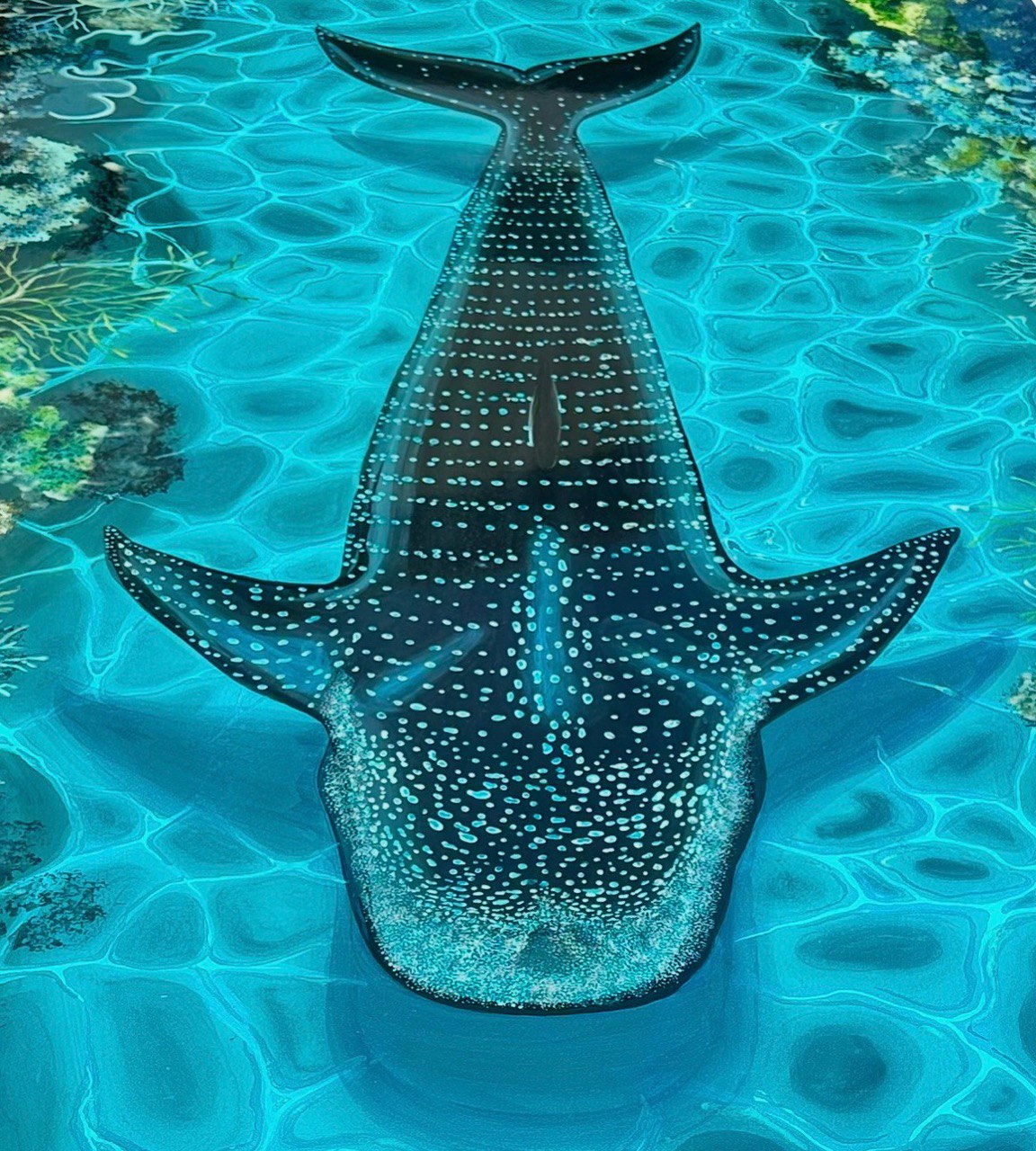 • Hand-painted whale shark and coral reef design with glowing water effect